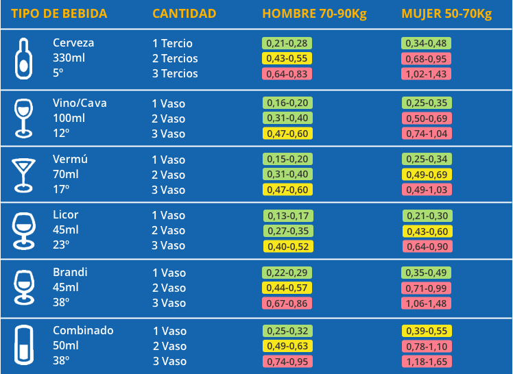 Para hacerte una idea de la tasa de alcohol en sangre que tendrías ingiriendo diferentes cantidades de alcohol mira la siguiente: